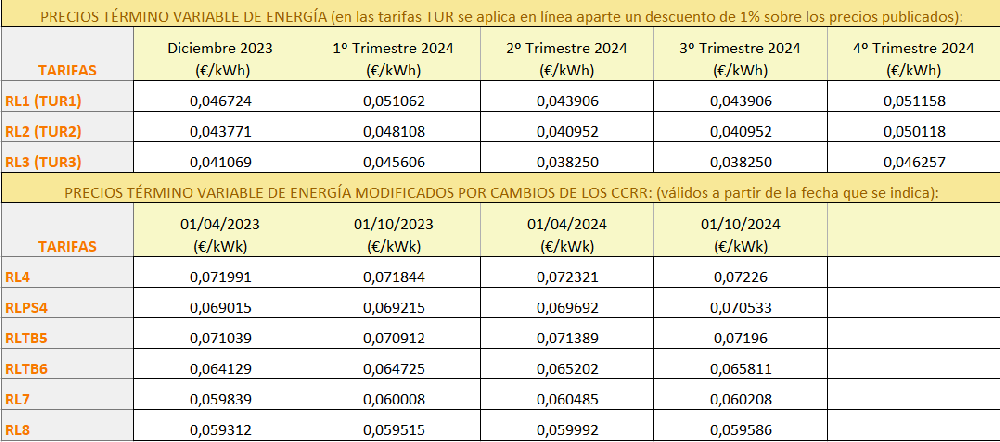 PRECIOS TÉRMINO VARIABLE ENERGÍA (en las tarifas TUR SE APLICA EN LÍNEA APARTE UN DESCUENTO DE 1% SOBRE LOS PRECIOS PUBLICADOS):