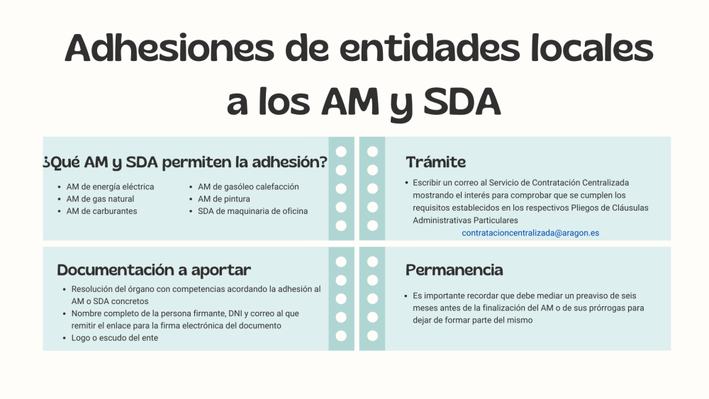 - ¿CÓMO PUEDE ADHERIRSE?: Mediante la suscripción del correspondiente Acuerdo de Adhesión. Para más información, remitir correo electrónico a: contratacioncentralizada@aragon.es
